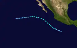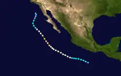 The origins of Hurricane Ismael were from a northward bulge of the Intertropical Convergence Zone (ITCZ) in early August, which resulted in the formation of a tropical depression on August 8. Six hours later, it was upgraded into Tropical storm Ismael. Continuing to intensity, Ismael was upgraded into a hurricane late on August 10 and subsequently developed an eye. The storm soon reached its peak of 100 mph (155 km/h). Late on August 11, Hurricane Ismael began to weaken as it encountered cooler waters and the hurricane was soon downgraded to a Category 1 on the SSHWS. The following day, Ismael was downgraded into a tropical storm about 380 mi (610 km) west of the Baja California peninsula. On August 14, the storm was downgraded into a tropical depression while centered about 250 mi (400 km) west of Point Ensenada.[7] Ismael dissipated that day.[3]