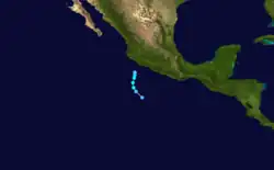 On July 30 and 31, a tropical disturbance crossed Central America. At a low latitude, a tropical depression was declared on August 3.[7] At first, the storm was expected to turn west-northwest,[17] but it continued west instead.[7] Nine-E failed to intensify despite being situated over warm water. The depression dissipated on August 7 later over somewhat cooler water.[7]