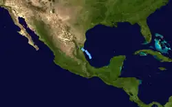 By September 6, the disturbance had emerged into the southwest Gulf of Mexico and consolidated into a smaller system which had enough organization to be classified as a tropical depression, the seventh of the season. The depression moved north-northwest into northeast Mexico on the afternoon of September 7, dissipating completely on September 8.[20]