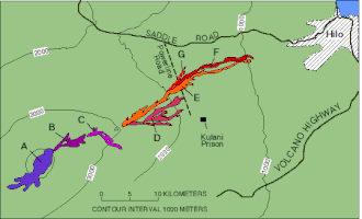 The fast-moving flow (flow E on map) advanced as a relatively narrow, channelized ‘a‘ā lava flow. Its rate of advance slowed as it moved downslope, but by March 29 the flow had moved 15.5 mi (24.9 km) to an elevation of 3,000 ft (910 m). At this time, the flow front was about 4 mi (6.4 km) from the outskirts of Hilo. Smoke from burning vegetation, loud explosions caused by methane gas along the advancing flow front and the intense glow at night all contributed to a growing concern among Hilo's residents.[2]