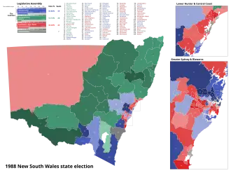 The result was a landslide for the Coalition parties. Election analyst Antony Green later noted that "the 1988 result was startling, the worst Labor performance, and best Coalition result, since the Lang era of the 1930s".[4] Labor lost heartland seats including Balmain, Newcastle and Swansea for the first time since the turn of the century.