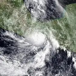 A tropical disturbance south of the Gulf of Tehuantepec became better organized on June 29 and became a tropical depression.[10] Strengthening was very limited as the depression was approaching land.[11] It made landfall later that day very near Salina Cruz, Oaxaca.[12] As it continued its west-northwest track, it dissipated inland after bringing torrential rains.[13]