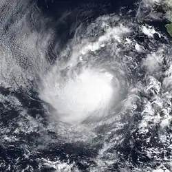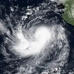 On November 7, an area of convection associated with a tropical wave developed into a tropical depression, while located about 560 mi (900 km) to the southeast of Acapulco, Mexico.[42] During that day the depression moved towards the northwest, intensified into a tropical storm and was named Nora later that day.[43][44] On the next day, the storm gradually intensified further while temporarily moving towards the west, due to the flow field around a strengthening high pressure system located to the north of Nora.[1] After developing an eye, Nora intensified into a hurricane.[42][45]