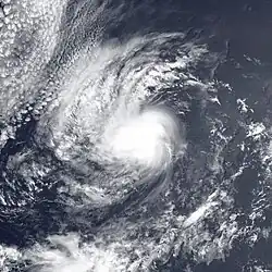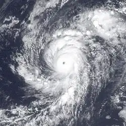 However, a well-defined eye reappeared on satellite imagery in the system and Kevin re-intensified to a low-end Category 3 hurricane with maximum winds of 115 mph (185 km/h) and a minimum pressure of 960 mbar (28 inHg) on October 7. But this was short-lived and on October 8 the hurricane began to weaken again and on October 9 it had entered into the Central Pacific basin as a waning Category 1 hurricane.[37] After this crossing, it was subsequently downgraded to storm strength the same day and on October 11, to a depression. It dissipated as a tropical cyclone that same day. The remnant circulation did persist a while longer as it slowly drifted north to finally lose its identity late on October 14.[19] Despite its long life, Hurricane Kevin caused no damage or casualties.[37] Because Kevin passed north of Hawaii, its only effect on land was increased trade winds.[19]