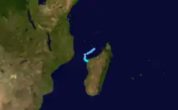 The ITCZ remained active in early March, spawning a tropical depression in the northern Mozambique Channel on March 2. It failed to organize at first, although an increase in convection on March 3 allowed the system to strengthen into Tropical Storm Ionia.[4] That day, it attained peak winds of 65 km/h (40 mph).[16] After passing about 50 km (30 mi) north of Juan de Nova island, Ionia progressed southeastward and approached the western Madagascar coastline. The circulation paralleled the coast for about 250 km (160 mi) before moving ashore at Belo on March 4. The storm weakened over land, re-emerging over open waters on March 5 from southeastern Madagascar. Ionia briefly re-intensified into a tropical depression that night,[4] but it lost tropical characteristics on March 7.[16] The remnants persisted several more days until dissipating south of the Mascarene Islands on March 11.[4]