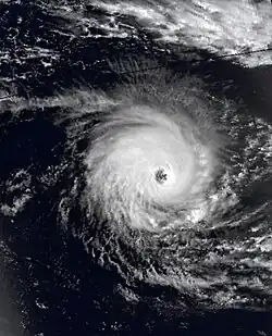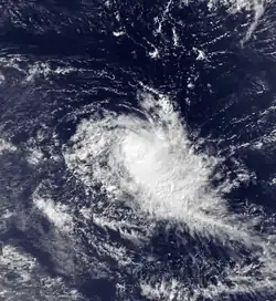 A few days after Colina formed, the ITCZ spawned another area of convection on January 16 in the northeast portion of the basin. The next day, a low-pressure area formed between the Chagos Archipelago and Diego Garcia, and on January 19 the system developed into a tropical disturbance after convection increased. Following further organization, the system intensified into Tropical Storm Edwina on January 20 while moving generally westward. Increasing wind shear prevented significant strengthening initially, but Edwina was able to intensify more on January 21.[4] On January 23, the JTWC upgraded the storm to the equivalent of a minimal hurricane on the same day that MFR upgraded Edwina to tropical cyclone status. On the next day, the JTWC estimated the cyclone attained peak winds of 205 km/h (125 mph),[13] after Edwina developed a well-defined 75 km (47 mi) wide eye.[4] On January 26, the MFR estimated that the cyclone reached peak 10-minute winds of 170 km/h (105 mph),[13] making Edwina the strongest storm of the season. Around that time, the cyclone turned more to the south around a large ridge,[4] maintaining peak winds through January 27. By that time, the eye became large and ragged while passing halfway between Rodrigues and St. Brandon. On January 27, Edwina passed about 220 km (140 mi) east of Mauritius. On the next day, increased wind shear caused marked weakening, quickly destroying the eye and lowering the winds below tropical cyclone force. On January 29, Edwina ceased existing as a tropical system, although its remnants persisted several more days, affecting Île Amsterdam in the south-central Indian Ocean on February 2.[4]