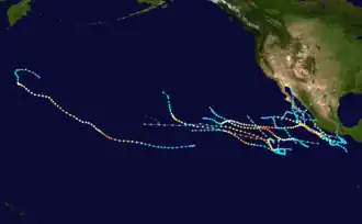 A majority of the season's storms formed from tropical waves between 10°N and southern coast of Mexico. While they generally followed the typical path away from Mexico before dissipating over cooler waters near 25°N, a persistent upper-level trough across the Western United States periodically curved storms into land.[4] Tropical Storm Beatriz produced heavy rainfall and downed trees across Southern Mexico, causing 6 fatalities. In July, Hurricane Calvin struck Southwestern Mexico, prompting the evacuation of 42,000 residents, the displacement of 1,600 people, and 37 deaths. This area was later affected by Hurricane Jova in September, which flooded houses. Hurricanes Dora, Eugene, and Fernanda produced generally minor rainfall across the Hawaiian Islands, alleviating drought conditions. However, their large swells caused damage to beachfront homes and caused the death of a fisherman offshore. Hurricane Hilary produced heavy rainfall across portions of Mexico and California in August. The next month, Hurricane Lidia destroyed hundreds of homes, displaced over 10,000 people, and resulted in 7 deaths.