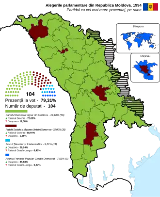 Early parliamentary elections were held in Moldova on 27 February 1994.[1] They were the country's first competitive elections, and followed deadlock in Parliament over the issue of joining the Commonwealth of Independent States.[2] The result was a victory for the Democratic Agrarian Party of Moldova (PDAM), which won 56 of the 104 seats.[3]
