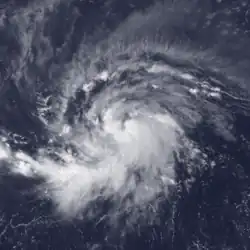 A frontal low situated between Bermuda and South Carolina developed into Tropical Depression Two late on July 6.[21] Strong wind shear initially prevented significant strengthening,[22] though by early on July 7, the depression became Tropical Storm Barry. A nearby trough enhanced convection and caused strengthening, with maximum sustained winds reaching 70 mph (110 km/h) later that day.[21] Later on July 8, Barry weakened slightly, falling to winds of 50 mph (80 km/h), an intensity it would retain until landfall.[21] An approaching mid-level trough accelerated the storm as it traveled roughly along the Gulf Stream.[23] Early on July 9, convection began to shift away from the storm's center. While moving rapidly northeastward, Barry made landfall in Hart Island, Nova Scotia, late on July 9.[21]
