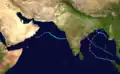 A low-pressure area accompanied by a well-defined circulation persisted over central India on October 11. By the following day, the system emerged into the Arabian Sea, whereupon its convection organized west of a sheared circulation. On October 12, the system organized into a depression, classified Tropical Cyclone 02A by the JTWC. Steered by a ridge, it moved to the west-northwest and gradually intensified. The IMD upgraded it to a cyclonic storm on October 14, estimating peak 3 minute winds of 85 km/h (55 mph). The JTWC assessed slightly higher 1 minute winds of 95 km/h (60 mph). Increased wind shear stripped away the convection, causing the storm to weaken. By October 17, the system deteriorated into a depression and began drifting to the southwest, having moved between two ridges. Later that day, the system degenerated into a remnant low, which the JTWC tracked for an additional day until dissipation east of the Somalia coastline.[2][3]
