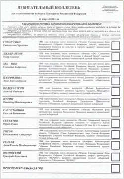 Of 33 candidates nominated, 15 submitted application forms to the Central Electoral Committee of Russia, which registered 12.[10] They are listed in the Russian alphabetical order they appeared on the ballot.