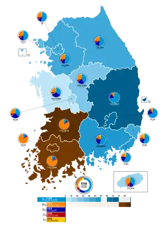 South Gyeongsang 843,662 55.0 189,463 12.4 329,486 21.5 73,893 4.8 82,645 5.4