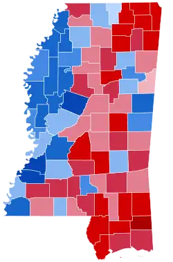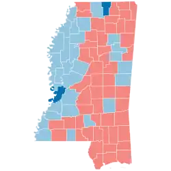 Romney and Ryan won Mississippi with 55.29% of the popular vote to Obama and Biden's 43.79%, thus winning the state's six electoral votes by an 11.50% margin.[1] Mississippi was one of just six states where Obama improved on his 2008 performance. According to exit polls, the black vote share in Mississippi increased from 33% in 2008 to 36% in 2012, likely explaining Obama's gains.[2] This was the strongest showing for a Democratic presidential candidate in Mississippi since native Southerner Bill Clinton's 44.08% in 1996. Obama carried Warren County, becoming the first Democrat to do so since John F. Kennedy in 1960.[3] He also managed to flip Benton County and improved his margins in Democratic counties throughout the state. As of the 2024 presidential election, this was the last time a Democratic presidential candidate has carried Benton, Chickasaw, and Panola counties. Obama's 562,949 votes is the highest total received by a Democratic presidential candidate in the state's history.
