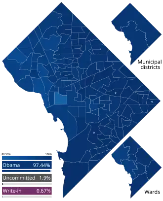 Running virtually unchallenged, Obama swept all of the capital's eight wards with more than 90% of the vote. He performed best in Wards 7 and 8 in DC's southeast part, securing more than 99% of the vote in each. Conversely, he earned his worst results in Wards 2 and 3, falling below 95% of the vote.[4]