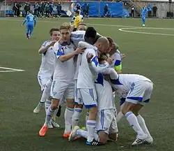 Faroese players celebrating their first goal in the 2015 match