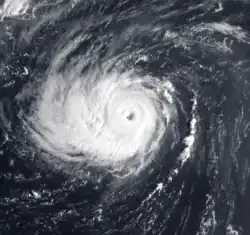 A tropical wave accompanied by a broad area of low pressure exited the western coast of Africa on September 6, acquiring sufficient organization to be declared a tropical depression by 12:00 UTC on September 11. Twelve hours later, the depression intensified into Tropical Storm Edouard. The newly formed cyclone moved northwest, steered around a subtropical ridge to its northeast. The storm intensified in a generally favorable environment and became a hurricane by 12:00 UTC on September 14. With a well-defined eye surrounded by intense eyewall convection, Edouard further strengthened into a major hurricane early on September 16, attaining peak winds of 120 mph (195 km/h) at 12:00 UTC, the first major hurricane in the Atlantic since Hurricane Sandy in 2012. The cyclone abruptly weakened thereafter as it curved northeastward in advance of an upper-level trough, falling below hurricane intensity by 00:00 UTC on September 19 and degenerating into a remnant low eighteen hours later. The remnant low moved generally southward, merging with a frontal boundary well south-southwest of the Azores on September 21.[64]