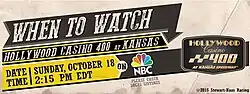 29. ^ a b c d e f g "2015 Hollywood Casino 400". Sprint Cup Series. Season 67. Kansas City, Kansas. October 18, 2015. Event occurs at 2:34 p.m. NBC Sports. NBC. Retrieved October 26, 2015.