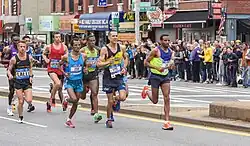 The first runners hit the 3.1-mile (5 km) point in 15:47 and the 6.2-mile (10 km) mark in 31:30.[7] By the halfway point (1:06:49), a thirteen-man lead pack had emerged led by Ethiopian Lelisa Desisa. At the 20-mile (32 km) mark, the lead pack had reduced to four, containing Kenyans Geoffrey Kamworor, Stanley Biwott and Wilson Kipsang Kiprotich, along with Desisa. Biwott took the lead in the 23-mile (37 km) and held on to win his first World Marathon Majors title in 2:10:34. Kamworor was fourteen seconds behind him to claim second and Desisa a further minute 22 seconds off in third.[2]