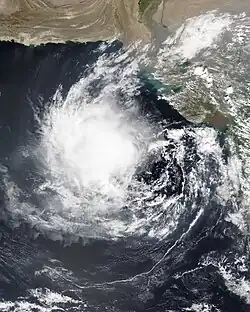 On November 17, the India Meteorological Department (IMD) noted the potential for tropical cyclogenesis over the central Arabian Sea in association with an area of low pressure near the Maldives.[32] Convective activity was enhanced by the Madden–Julian oscillation while sea surface temperatures of 29 to 30 °C (84 to 86 °F) and low wind shear favored additional development.[33][34] By November 18, a weak low-level circulation developed about 1,185 km (736 mi) east-southeast of Socotra.[34] Organization thereafter was stymied as it became embedded within a monsoon trough. Two additional circulations developed to the east and west of the original low; however, the original low steadily became the dominant system by absorbing the previous two circulations.[35] On November 21, two scatterometer passes revealed a single, well-defined low with gale-force winds underneath an area of flaring convection.[36] At 18:00 UTC, the IMD classified the system as Depression ARB 04 about 410 km (250 mi) east-southeast of Socotra.[37] Similarly, the Joint Typhoon Warning Center (JTWC) initiated advisories on the system as Tropical Cyclone 03A. Steered west by a subtropical ridge to the north, little intensification was expected before the cyclone's forecast landfall in Somalia.[36]