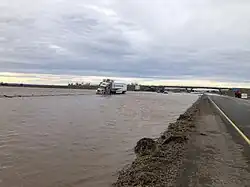 Among the numerous roads that were damaged by flooding was Interstate 84, the only east–west Interstate in Oregon. Near Echo, the Umatilla River completely covered the road, forcing the Oregon Department of Transportation (ODOT) to close it for a time with some motorists abandoning their vehicles on the road.[6] Once the waters receded, ODOT opened one lane each direction with a lowered speed limit, but full repairs took some time to complete.[2] Six other state highways were closed in northeast Oregon, and it is estimated that the cost of damage in that region was $48 million.[16][17]