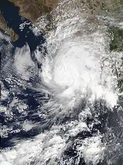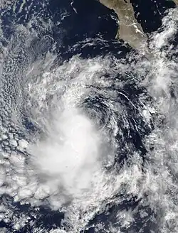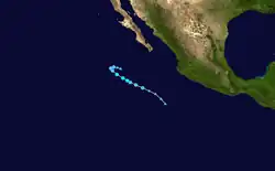 On July 26, the NHC noted a disturbance located about 700 miles (1,125 km) south-southwest of the southern tip of Baja California. The system moved parallel to another disturbance which later became Hurricane Hilda.[50] By 21:00 UTC on July 30, the disturbance attained a well-defined center of circulation with sufficient organized convection and was classified as a tropical depression, bearing the designation Nine-E.[51] The depression was initially forecast to become a tropical storm, but failed to do so due to dry air and wind shear caused by nearby Hurricane Hilda. Early on August 1, the system degenerated into a remnant low.[52] Even though Nine-E was a tropical low, the NHC still monitored the system for further development[53] On August 4, it re-intensified into a tropical depression again while maintaining two rainbands in a slightly elongated circulation.[54] On the next day, at 09:00 UTC, the depression intensified into a tropical storm, with the NHC naming it as Jimena, as the storm's deep convection had increased near the low-level center and based on satellite imagery, the storm was producing tropical storm force winds.[55] The convection later diminished on August 6, as it moved over cooler sea-surface temperatures and encountering high wind shear and dry airmass. However, despite all this, Jimena managed its intensity, as it continued to produce tropical storm force winds, based on ASCAT data.[56] A deep convective mass also continued to persist over the center of Jimena.[57] At 21:00 UTC, the NHC issued its last advisory, downgrading the system to a tropical depression as it entered the CPHC's area of responsibility. Its deep convection weakened significantly as it moved over cool sea surface temperatures causing Jimena to weaken.[58] The CPHC later issued its only bulletin for Jimena at 03:00 UTC the next day, stating that Jimena had become a post-tropical cyclone as its deep convection had collapsed completely.[59]