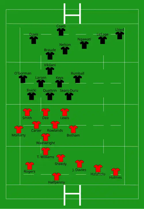 | Try: Williams (2) 6' c, 45' c Botham 14' m Holmes (2) 20' c, 80+1' c Smith 27' c Dee 31' c Rowlands 36' c Basham (2) 56' c, 61' c Con: Sheedy (7/8) 7', 21', 28', 32', 37', 46', 57' B. Thomas (2/2) 62', 80+3' | Report | Try: Lloyd 4' m Coats 68' c Con: Nelson (1/2) 68' |