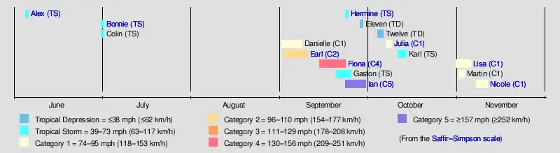 Hurricane Nicole (2022)Hurricane Lisa (2022)Hurricane Julia (2022)Tropical Storm Hermine (2022)Hurricane IanHurricane FionaHurricane Earl (2022)Hurricane Bonnie (2022)Tropical Storm Alex (2022)Saffir–Simpson scale