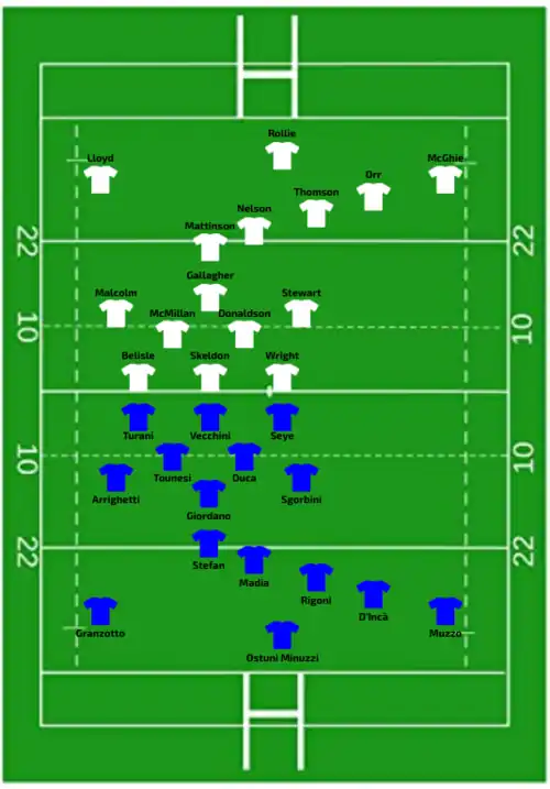| Try: Penalty try 8' Jones 62' c Corrigan 79' c Con: O'Brien (2/2) 63', 79' | Report | Try: Vecchini (2) 25' m, 57' c Fedrighi 33' c Muzzo 69' m Con: Rigoni (2/4) 34', 58' Pen: Rigoni (1/1) 36' |