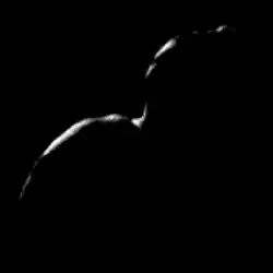 486958 Arrokoth (provisional designation 2014 MU69; formerly nicknamed Ultima Thule[a]) is a trans-Neptunian object located in the Kuiper belt. Arrokoth became the farthest and most primitive object in the Solar System visited by a spacecraft when the NASA space probe New Horizons conducted a flyby on 1 January 2019.[17][18][19] Arrokoth is a contact binary 36 km (22 mi) long, composed of two planetesimals 21 and 15 km (13 and 9 mi) across, that are joined along their major axes. With an orbital period of about 298 years and a low orbital inclination and eccentricity, Arrokoth is classified as a cold classical Kuiper belt object.