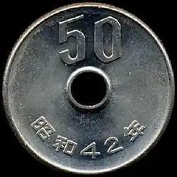 1. ^ 50 yen coin changes in 1967 include a reduction in diameter from 25 to 21 mm, and a weight change from 5 grams to 4. The size of the center hole was also reduced from 6 mm in diameter to 4.