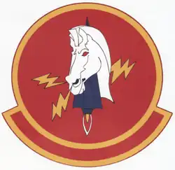 1. ^ Approved 23 April 1963. Description: On a red disc edged Air Force golden yellow, an Air Force blue stylized missile in palewise upward flight emitting Air Force golden yellow, red, and white exhaust to base, all surmounted by a white Trojan horse's head in profile, his eye red, outlines and details black; originating in sinister an Air Force golden yellow lightning bolt disappearing behind the horse's head and issuing from the horse’s nostrils to dexter and dexter base. Significance: Against a scarlet background (to represent valor), the head of a white Trojan horse, his eye flashing red, his nostrils emitting lightning bolts, represents the strength and might of this unit. The stylized missile indicates this unit's space age weapons system.