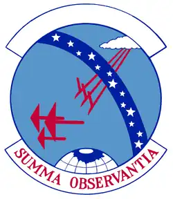 2. ^ Approved 31 December 1959. Description: On a light blue disc, a white cloud issuing from sinister (left) chief, outlined Air Force blue, issuing from the cloud, bend sinisterwise, three red air refueling booms pointing to three red stylized aircraft in dexter (right); all above the top of a white globe issuing from base and grid lines of Air Force blue, over all, bendwise arched, an Air Force blue ribbon spattered with white stars. Significance: The emblem symbolizes the squadron's support to SAC through air refueling of bombers that provide the war deterrent force of the United States. Through its direct support, the squadron helps to further peace throughout the world. The emblem represents a refueling operation. The dark blue band with stars identifies the operation with the Strategic Air Command and represents the night refueling capability. The background represents the unit's daylight capability and the globe is symbolic of global operations.