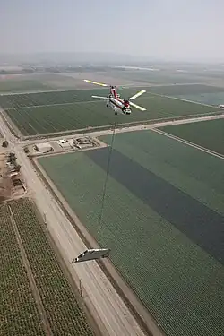 Hertz convinced the client to purchase the 747 airplane, originally worth about $25 million when Boeing completed it in 1970, for US$35,000. Mark Thompson of Thompson Aviation sold the airplane and his team detoxified, cut apart, and transported the plane for airlift. Using a laser and the cut-off saws at the Victorville Airport, home of the second largest airplane graveyard in the nation, the cockpit and tail were removed and the fuselage cut longitudinally. Next, transverse sectioning reduced large segments of fuselage and the wings to a manageable size for transport. A truck carried the parts, measuring 47 by 125 feet (14 by 38 m), successfully without damage. Seven California Highway Patrol vehicles escorted the truck during the night and closed multiple lanes of three major freeways, State Routes 2 and 15, and US Route 101, to accommodate the vehicle. The wings traveled from the Southern California Logistics Airport aircraft boneyard to Camarillo Airport in Camarillo, California, located 10 miles from the site. At that point, because each wing weighed approximately 20,000 lb (9,100 kg) and the only way to transport such heavy, unwieldy sections to a remote destination was from above (navigation by truck was deemed impossible), the wings needed to be cut in two for proper positioning for transport by helicopter, which was completed by a Columbia Model 234 operated by Columbia Helicopters Inc. of Portland, Oregon and took over two hours to complete. The helicopter positioned the wings on a large pile of tires at the site. The wings were then spliced back together and lifted onto columnar supports, attaching the custom fabricated steel brackets on the columns to the engine mounts on the wings. The wings touched the ground at few points creating minimal foundation requirements.