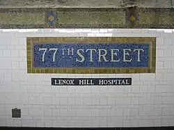 The 77th Street station (also known as 77th Street–Lenox Hill Hospital) is a local station on the IRT Lexington Avenue Line of the New York City Subway, located at the intersection of Lexington Avenue and 77th Street on the Upper East Side of Manhattan. It is served by the 6 train at all times, the <6> train during weekdays in the peak direction, and the 4 train during late nights.