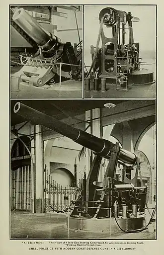 The M1888 8 in (203 mm) gun was a coastal artillery gun initially deployed as part of the Endicott system of fortifications. The first nine were deployed on the M1892 barbette carriage in 1898, but the improved M1894 and M1896 disappearing carriages soon became available, and approximately 64 additional weapons were deployed on these carriages by 1908. An "emergency" converted Rodman carriage was also used during the Spanish–American War in 1898 to quickly arm 21 emplacements with the modern 8-inch M1888 gun.[4][5] These weapons were redeployed soon after the war ended. The disappearing carriage allowed the gun to remain behind a parapet resembling a hillside most of the time, thus largely invulnerable to low-angle enemy fire, which was the only type of enemy attack anticipated 1898–1910. Air and high-angle artillery attack would eventually severely impact US fortifications in the Philippines in World War II.