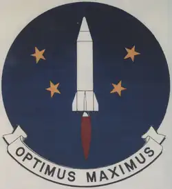- ^ Approved 7 November 1958. Description: On an Air Force blue disc, a white missile pointing upward, trailing red exhaust to base, between four Air Force golden yellow stars forming a "V" pattern, two in dexter, and two in sinister, outlines and details black throughout.
