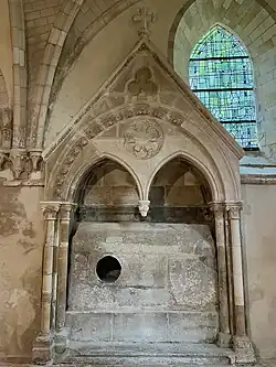 The Abbey is dedicated to Saint Honorine. According to the legend, Honorine of Melamare was martyred by the pagans of Lillebonnen in 303, burned in Tancarville, and thrown into the water of the Seine River. Her body is believed to have been found in the harbor of l'Eure and put into a sarcophagus, which was then buried near the Abbey. However, the excavations as well as the historical and archeological research in the region have shown that this legend is far from being true.[3] According to the researchers, most probably in the 6th century the relics of Saint Honorine were sent from the Cathedral of Bayeux to Graville due to the threat of Normand invasion from the west. Thus, the legend about the body found in Eure is not quite accurate. Once the relicts were received, they were put into a sarcophagus, which was placed in the gothic choir of the Abbey. According to Abbot Cochet,[4] an archaeologist and historian of the 19th century, the sarcophagus could have been built at the end of the Roman period or at the start of the Merovingian epoch. Later, due to frequent invasions by the Vikings[5] in the region throughout the 9th century, the relics were transferred to Conflans-Sainte-Honorine in 989, nevertheless, the sarcophagus was preserved at the Abbey and can be still found in the church to the left from the altarpiece. Even though the body of the saint was no longer kept at the Abbey, the sarcophagus has remained an attraction for pilgrims since the Middle Ages.