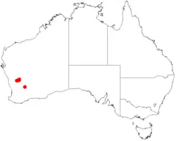 This species of wattle is only known from Mount Gibson and Ninghan Station stations in the Avon Wheatbelt and Yalgoo bioregions of south-western Western Australia, where it grows on rocky hills.[2][3][4]