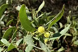 Acacia confluens, commonly known as wyrilda,[3] is a species of flowering plant in the family Fabaceae and is endemic to South Australia. It is a shrub with a spreading, umbrella-like crown and glabrous branchlets, narrowly elliptic phyllodes, spherical heads of pale yellow to yellow flowers and glabrous, thickly leathery to more or less woody pods, rounded over the seeds.