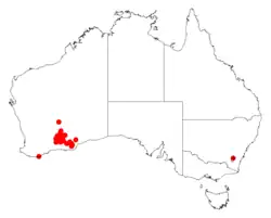 It is native to an area in the Goldfields-Esperance region of Western Australia where it is found amongst granite outcrops growing in skeletal sandy or loamy soils.[1] It has a scattered distribution from around Kambalda in the north to around Gilmore Rocks in the south and to Breeborinia Rock, about 100 km (62 mi) south of Balladonia in the east where it forms part of shrubland or mallee communities.[2]