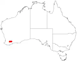 It is native to an area in the Wheatbelt region of Western Australia where it is commonly situated on low rocky hills and rises where it grows in gravelly lateritic soils.[3] It has a limited distribution around Lake Grace as a part of low shrubland or open heath communities.[4]
