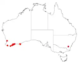 It is native to an area along the south coast in the Goldfields-Esperance and Great Southern regions of Western Australia where it is commonly situated in moist areas, on low rises and rocky hillsides growing in gravelly sandy soils over and around areas of laterite.[1] The range of the plant extends from around Cape Riche in the west to the Fitzgerald River National Park as a part of mallee heath or mixed scrub communities.[2]
