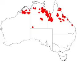 It is native to an area in the Kimberley region of Western Australia where it is found along riverbanks and rocky creek beds and around permanent water sources.[1] The range of the species extends across the top end of the Northern Territory and into northern Queensland where it is also found on river beds and creek banks as well as sandy beaches in mangrove communities growing in gravelly sands.[2]