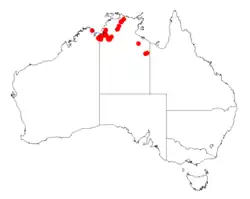 It is native to the Northern Territory and the Kimberley region of Western Australia where they are found amongst sandstone outcrops[1] and on sandstone hills. The western end of the plants native range is to the east of Kununurra, it then has a scattered distribution through the top end of the Northern Territory including the Keep River National Park and around Mount Brockman in the Kakadu National Park.[2]
