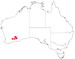 It is native to an area in the southern Goldfields region of Western Australia where it is found on plains and low rocky ridges growing in granitic loamy sands or clay sand soils.[1] The species has a scattered distribution between Kambalda in the north down to around Norseman in the south where it is usually found as a part of low open shrubland communities.[2]