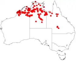 It is native to Kimberley region of Western Australia[1] and has a scattered distribution through the top end of the Northern Territory as far east as Springvale close to the border with Queensland where it is often found along ephemeral watercourses growing in sandy or loamy soils as a part of riparian forest or open woodland communities usually including species of Melaleuca.[2]