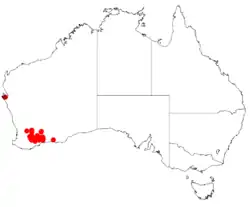 It is native to an area in the Wheatbelt, Goldfields-Esperance and Great Southern regions of Western Australia growing in sand, sandy gravel or clay soils.[1] It has a scattered distribution from around Bruce Rock in the north down to near Ongerup in the south and out as far as Lake King and Speddingup in the east. It is usually part of the heath under-storey open Eucalyptus scrubland communities.[2]