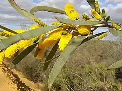 The slender, straggly, weeping tree or shrub typically grows to a height of 1 to 4 metres (3 to 13 ft).[1] The pendulous or arching branchlets are often covered in a fine white powder. Like most species of Acacia it has phyllodes rather than true leaves. The evergreen phyllodes usually have a pendulous forn with a linear to linear-elliptic shape and are straight to slightly curved. The grey-green and coriaceous phyllodes have a length of 10 to 20 cm (3.9 to 7.9 in) and a width of 4 to 10 mm (0.16 to 0.39 in) and have numerous fine nerves numerous and a prominent yellow coloured pulvinus.[2] It blooms from August to October producing yellow flowers.[1] The inflorescences occur in groups of one to four flower-spikes with a cylindrical shape. The spikes have a length of 12 to 23 mm (0.47 to 0.91 in) and a diameter of 6 to 7.5 mm (0.24 to 0.30 in). The coriaceous seed pods that form after flowering have a curved to linear shape and are raised over seeds. The pods have a length of up to 7 cm (2.8 in) and have a width of 5 to 6 mm (0.20 to 0.24 in) and are glabrous with a powdery white coating. The glossy dark brown seeds inside are arranged longitudinally and have a compressed subdiscoid shape with a length of 4 to 4.5 mm (0.16 to 0.18 in).[2]