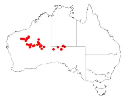 It is native to a large area in the Pilbara and northern Goldfields regions of Western Australia[2] where its distribution is scattered and its range extends from around 150 km (93 mi) north west of Wiluna in the south then eastwards into the Gibson Desert. In the north it is found on Balfour Downs and Ethel Creek Stations as well as in the Hamersley Range. The species shares much of the range of Acacia thoma. It is often situated on gently undulating plains and stony hardpan plains with skeletal shallow red-brown loamy soils mixed with ironstone pebbles and cobbles as a part of open Mulga woodland communities, sometimes with a spinifex understorey.[1]