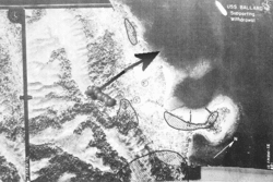 Map overlay on an aerial photo of the Point Cruz area showing the U.S. Marine retreat from the ridge (center) to the coast for withdrawal by landing craft (black arrow). The shaded areas represent the Japanese positions. The destroyer USS Monssen that supported the withdrawal is misidentified as the USS Ballard in this picture.